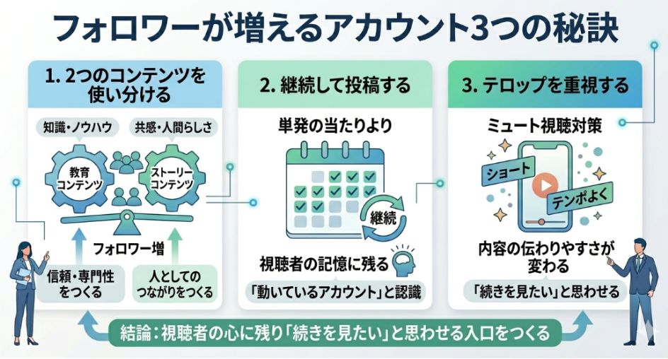 企業アカウントでも個人アカウントでも、動画に出てくる人が毎回変わるより、ひとりの顔が見える方が覚えてもらいやすくなります。