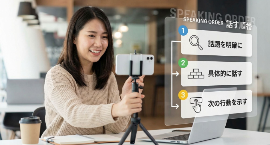 動画では、次の順番を意識するだけで、分かりやすさは大きく変わります。