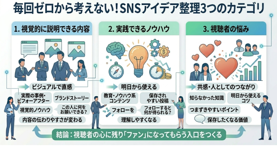 SNS運用では、投稿を思いつきで作るよりもテーマを整理して作る方が続きやすいです。