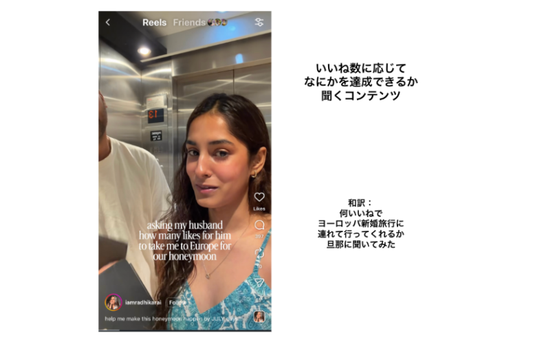 例えば、エレベーター内で「この動画が何いいねいったら新婚旅行でヨーロッパに連れて行ってくれる?」と夫に聞く。あるいは、有名人に「何いいねでフォロバしてくれる?」と直接聞く。構成はシンプルで、冒頭にテロップで“達成したいこと”と“必要ないいね数”を提示し、その場で条件を決めるだけ。編集もほとんどなく、1シーンで完結する動画が主流になっている。