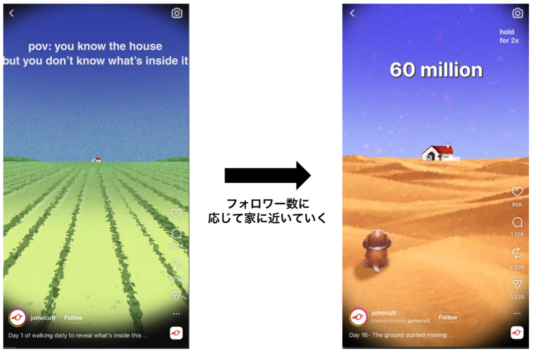 使っていたのは、一時期流行った「1フォロワーごとに1回何かをする」というフォーマット。Jumoはそれを、「1フォロワー増えるごとに、遠くの家に一歩ずつ近づく」という企画に置き換えた。