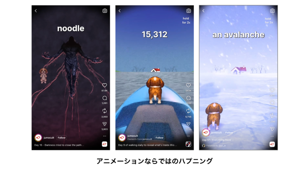 しかも実写ではなく、AIやイラストを活用したアニメーテッドコンテンツで展開していた。この形式だったからこそ、ただ近づくだけではなく、途中で災害が起きたり、犬の相棒が現れたり、モンスターに遭遇したりと、物語をいくらでも広げられた。