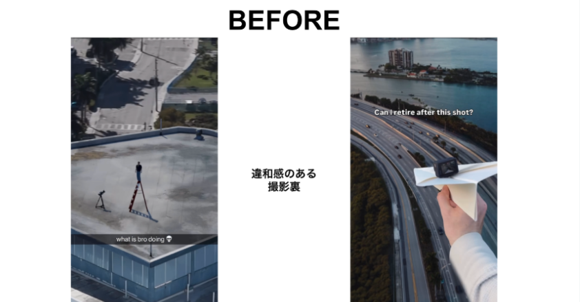 たとえば屋上の脚立のカットであれば、最初は「何をしているのか」がわからない。だが次のカットでは、その仕掛けが大きな映像体験に変わる。紙飛行機の例も同じで、実際にそのまま撮っているわけではなくても、最初にその絵を見せられることで視聴者は一度引っかかる。そこからドローンショットの完成映像へつなぐことで、違和感が驚きに変わる。